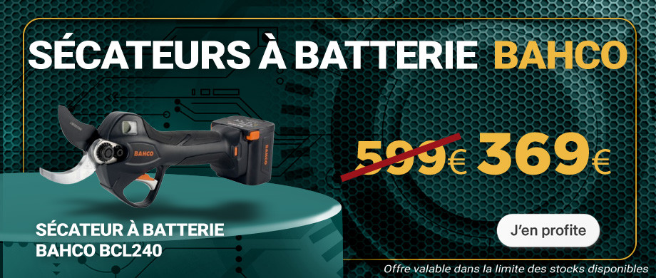 359,00 € -210,00 €149,00 €Découvrez le sécateur à batterie Bahco BCL226, idéal pour la taille rapide et précise des petites vignes et branches fines jusqu’à 26 mm de diamètre. Équipé de lames en acier SK5, d’un corps renforcé avec poignée souple et d’une double ouverture 15/26 mm, il allie confort, maniabilité et durabilité. Sa batterie Li‑Ion 10,8 V – 2,5 Ah offre une autonomie de 2–3 heures avec un temps de charge de 90 min et un écran intelligent indique le nombre de coupes et l’état de charge. Livré avec 2 batteries, chargeur, lames et graisse, le Bahco BCL226 garantit des coupes nettes et fiables pour un usage professionnel ou amateur exigeant.